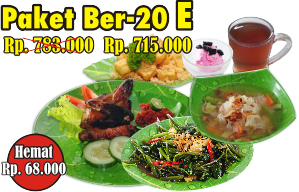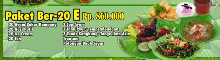 Paket Ber-20 E : 715.000 Isi : 20 Ayam Bakar Kampung 20 Nasi Putih 20 Ice Cream 20 Teh 3 Sup Ayam 3 Tahu Pyur / Tempe Mendoan 3 Tumis Kangkung / Tauge Ikan Asin / Trancam Potongan Buah Segar