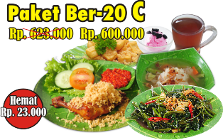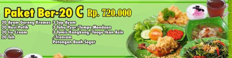 Paket Ber-20 C : 600.000 Isi : 20 Ayam Goreng Kremes 20 Nasi Putih 20 Ice Cream 20 Teh 3 Tahu Pyur / Tempe Mendoan 3 Tumis Kangkung / Tauge Ikan Asin / Trancam Potongan Buah Segar