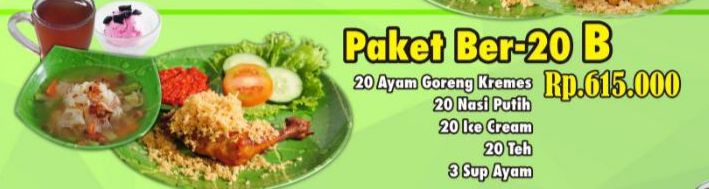 Paket Ber-20 A : 565.000 Isi : 20 Ayam Goreng Kremes 20 Nasi Putih 20 Ice Cream 20 Teh 3 Sup Ayam 3 Tahu Pyur / Tempe Mendoan