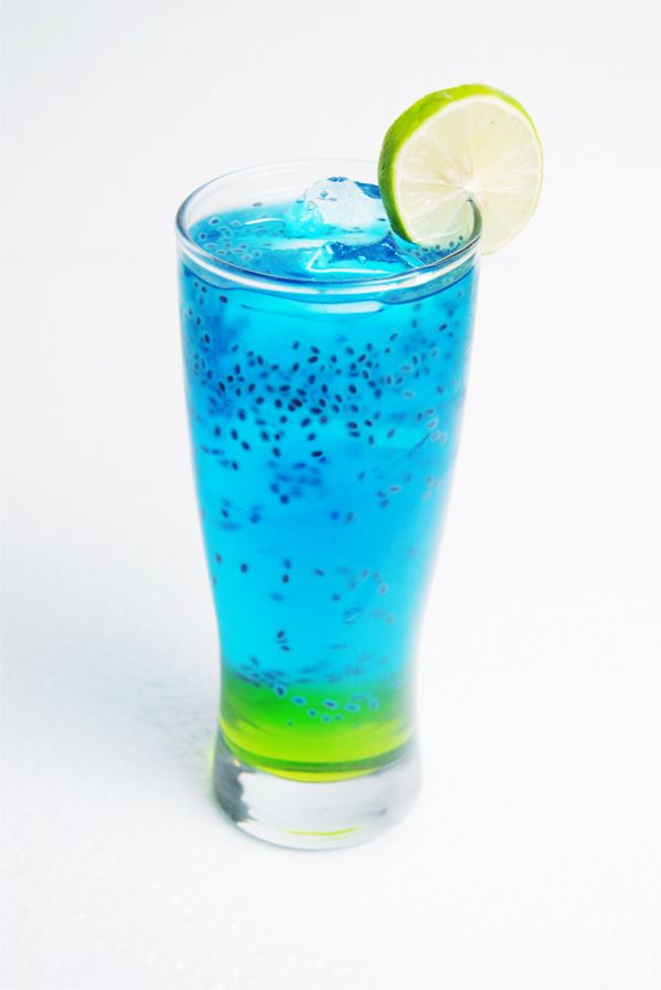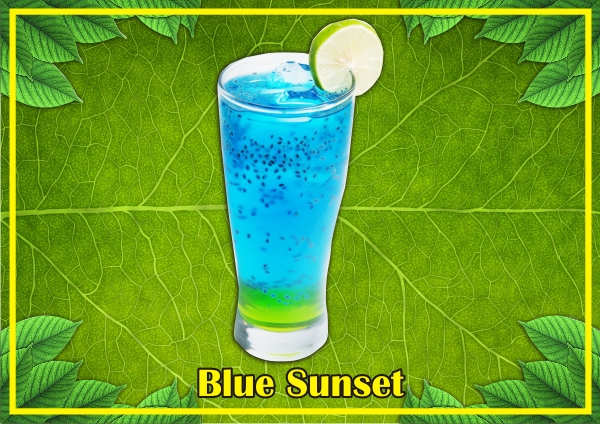 Minuman dengan warna yang menarik dari kombinasi warna hijau dan biru.yang dihasilkan dari sirup melon dan minuman bersoda.ditambah biji selasih sebagai campuran isi dari minuman blue sunset.